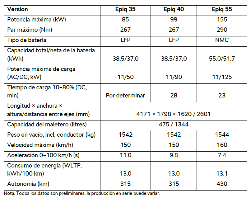 El coche está propulsado por dos versiones diferentes del nuevo motor eléctrico APP290 en tres variantes de potencia, combinadas con dos baterías de tracción diferentes. La variante Epiq 35 ofrece 85 kW, mientras que la Epiq 40, más potente, proporciona 99 kW, ambas combinadas con una batería con una capacidad total de 38,5 kWh. La Epiq 55, la más alta de la gama, ofrece 155 kW con una batería de 55 kWh.